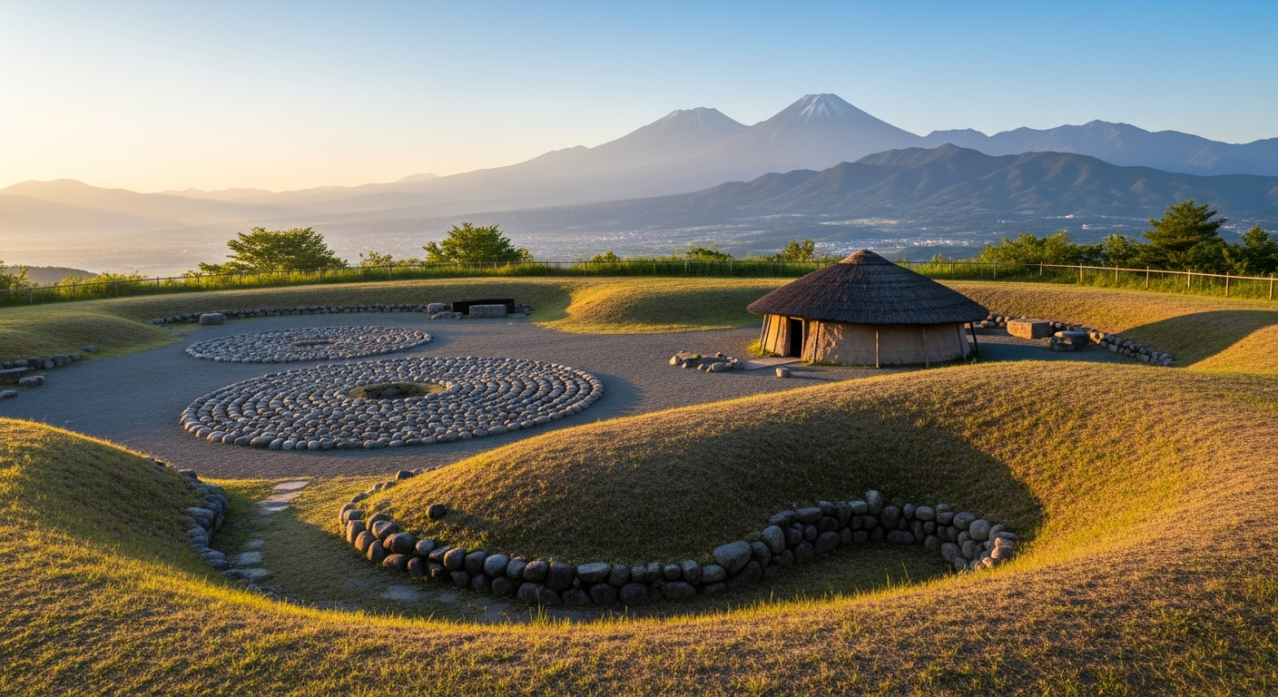 AI Image縄文前期の大規模な環状集石群・列石群を持つ祭祀遺跡。八ヶ岳連峰を望む広大な平らな台地に位置する。