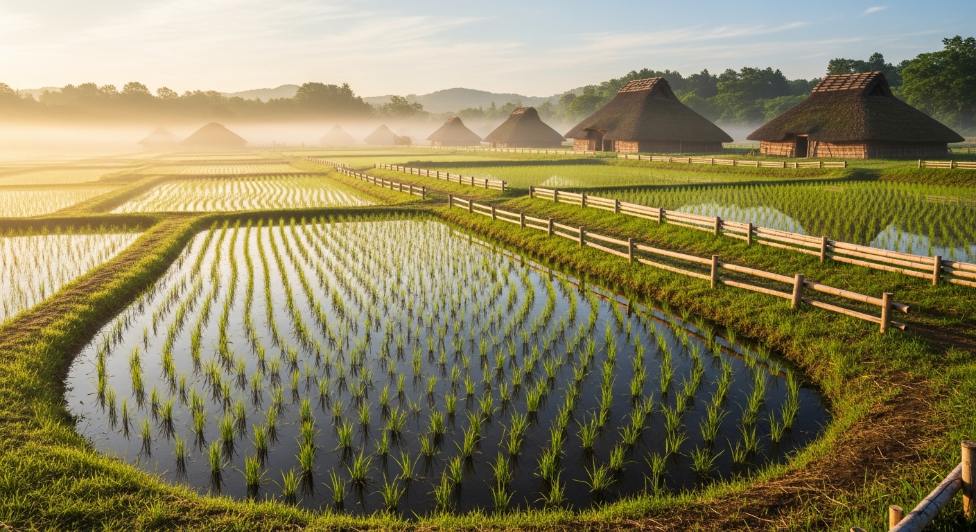AI Image国の史跡。縄文時代晩期に日本最古級の水稲耕作が行われていた水田跡。縄文から弥生への移行を示す重要な遺跡。